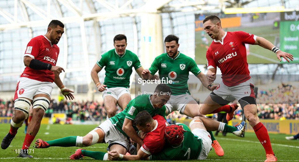8 February 2020; Dan Biggar of Wales is tackled by Jonathan Sexton, left, and Josh van der Flier of Ireland during the Guinness Six Nations Rugby Championship match between Ireland and Wales at the Aviva Stadium in Dublin. Photo by Ramsey Cardy/Sportsfile
