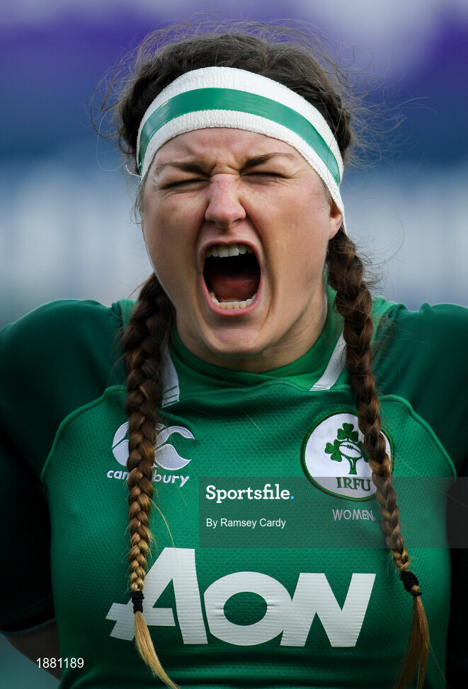 9 February 2020; Anna Caplice of Ireland sings the national anthem prior to the Women's Six Nations Rugby Championship match between Ireland and Wales at Energia Park in Dublin. Photo by Ramsey Cardy/Sportsfile