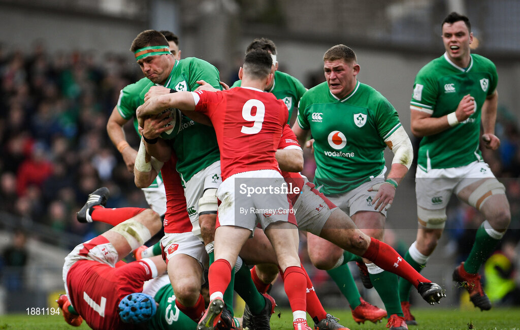 8 February 2020; CJ Stander of Ireland is tackled by Tomos Williams of Wales during the Guinness Six Nations Rugby Championship match between Ireland and Wales at the Aviva Stadium in Dublin. Photo by Ramsey Cardy/Sportsfile