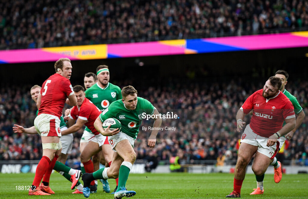 8 February 2020; Jordan Larmour of Ireland during the Guinness Six Nations Rugby Championship match between Ireland and Wales at the Aviva Stadium in Dublin. Photo by Ramsey Cardy/Sportsfile