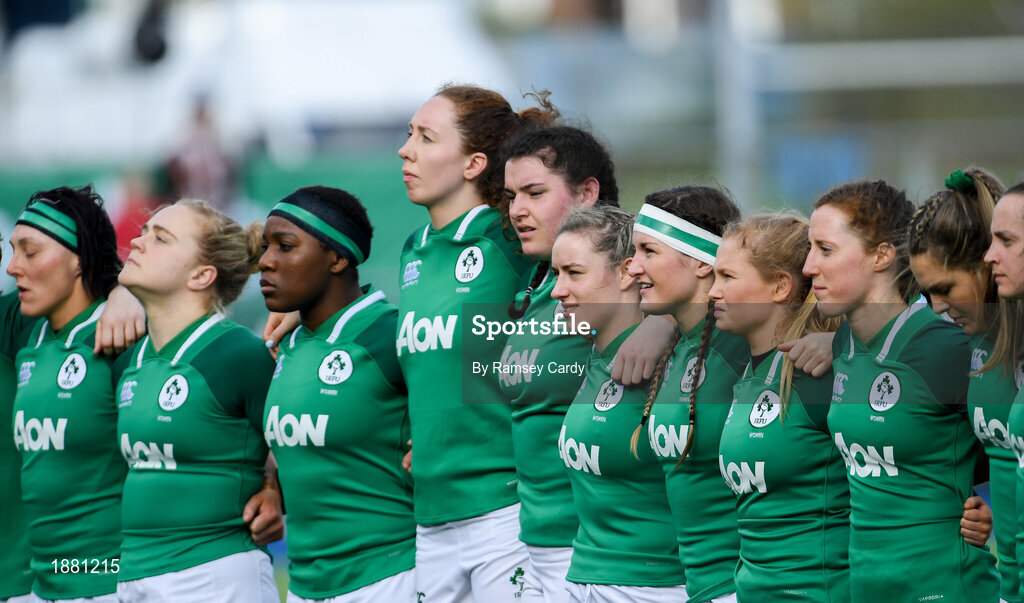 9 February 2020; Ireland players stand for the national anthems prior to the Women's Six Nations Rugby Championship match between Ireland and Wales at Energia Park in Dublin. Photo by Ramsey Cardy/Sportsfile