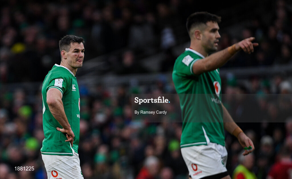 8 February 2020; Jonathan Sexton, left, and Conor Murray of Ireland during the Guinness Six Nations Rugby Championship match between Ireland and Wales at the Aviva Stadium in Dublin. Photo by Ramsey Cardy/Sportsfile