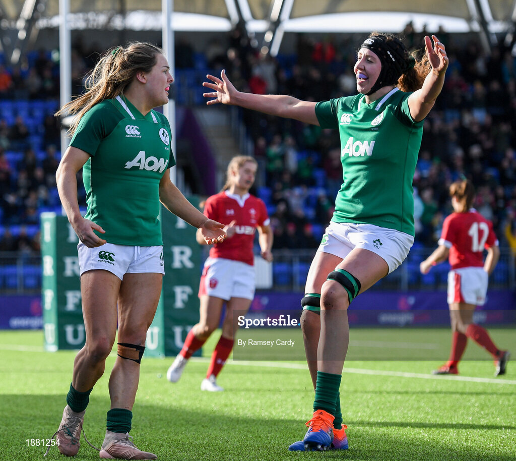 9 February 2020; Beibhinn Parsons of Ireland celebrates after scoring her side's first try with team-mate Aoife McDermott during the Women's Six Nations Rugby Championship match between Ireland and Wales at Energia Park in Dublin. Photo by Ramsey Cardy/Sportsfile