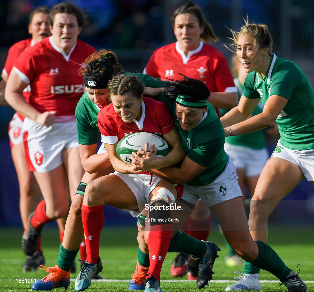 9 February 2020; Jasmine Joyce of Wales is tackled by Aoife McDermott, left, and Lindsay Peat of Ireland during the Women's Six Nations Rugby Championship match between Ireland and Wales at Energia Park in Dublin. Photo by Ramsey Cardy/Sportsfile