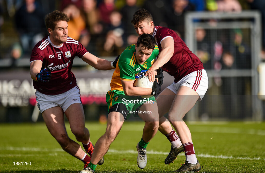 9 February 2020; Eoin McHugh of Donegal in action against Gary O'Donnell, left, and Johnny Heaney of Galway during the Allianz Football League Division 1 Round 3 match between Donegal and Galway at O'Donnell Park in Letterkenny, Donegal. Photo by Oliver McVeigh/Sportsfile