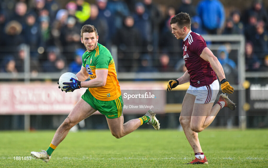 9 February 2020; Eoghan Ban Gallagher of Donegal in action against Shane Walsh of Galway during the Allianz Football League Division 1 Round 3 match between Donegal and Galway at O'Donnell Park in Letterkenny, Donegal. Photo by Oliver McVeigh/Sportsfile