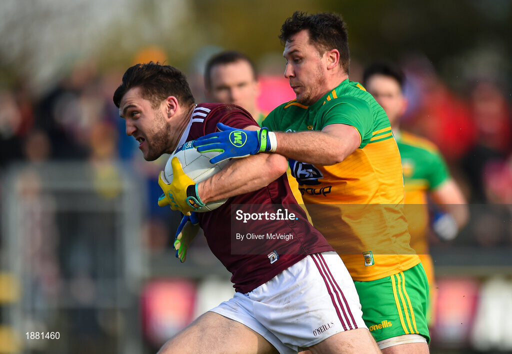 9 February 2020; Paul Conroy of Galway in action against Andrew McClean of Donegal during the Allianz Football League Division 1 Round 3 match between Donegal and Galway at O'Donnell Park in Letterkenny, Donegal. Photo by Oliver McVeigh/Sportsfile