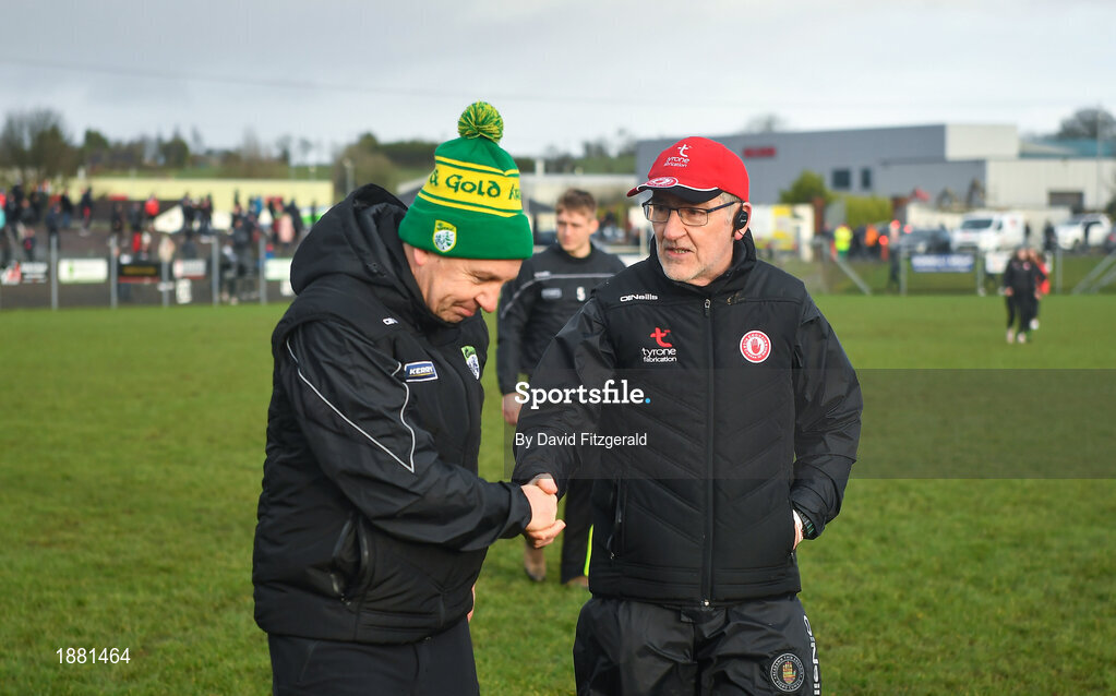 9 February 2020; Tyrone manager Mickey Harte, right, and Kerry manager Peter Keane following the Allianz Football League Division 1 Round 3 match between Tyrone and Kerry at Edendork GAC in Dungannon, Co Tyrone. Photo by David Fitzgerald/Sportsfile
