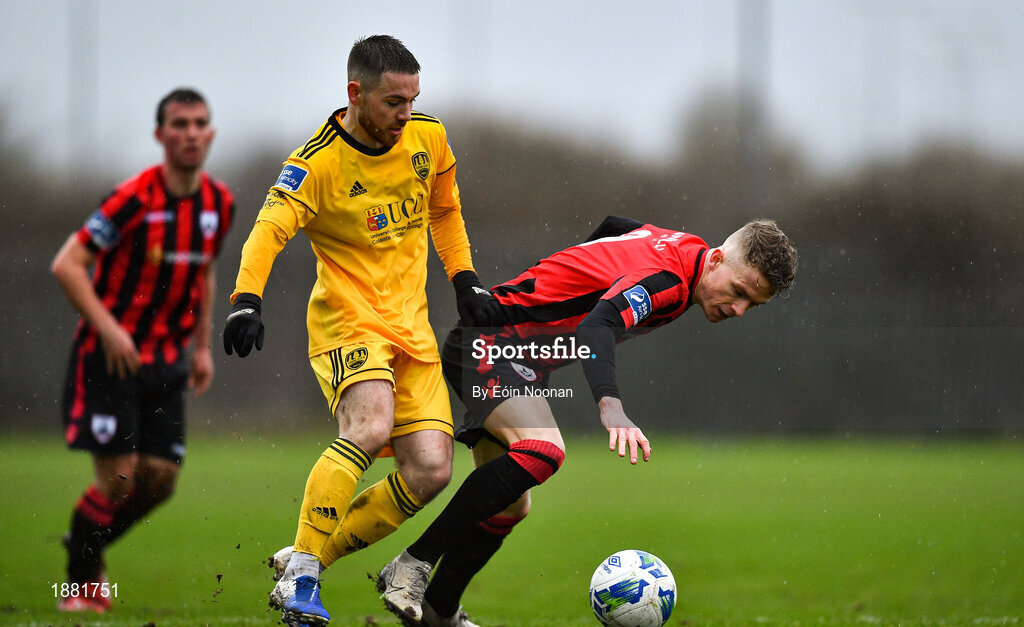 8 February 2020; James English of Longford Town is tackled by Dylan McGlade of Cork City during the pre-season friendly match between Cork City and Longford Town at Cork City training ground in Bishopstown, Cork. Photo by Eóin Noonan/Sportsfile