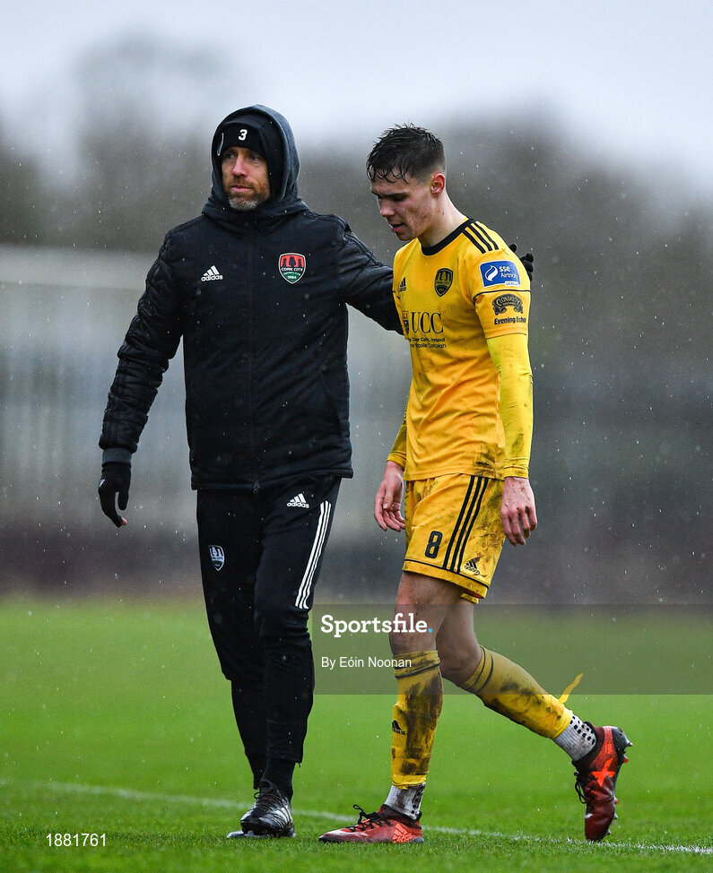 8 February 2020; Cork City assistant coach Alan Bennett consoles Cian Coleman after he is asked to leave the pitch during the pre-season friendly match between Cork City and Longford Town at Cork City training ground in Bishopstown, Cork. Photo by Eóin Noonan/Sportsfile