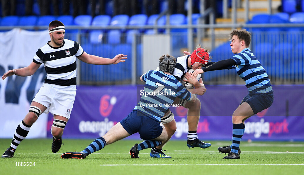 10 February 2020; Darragh Coan of Belvedere College in action against Ciarán McCarrick, left, and Alex Creedon of St Vincent's Castleknock College during the Bank of Ireland Leinster Schools Senior Cup Second Round match between Belvedere College and St Vincent's Castleknock College at Energia Park in Dublin. Photo by Piaras Ó Mídheach/Sportsfile
