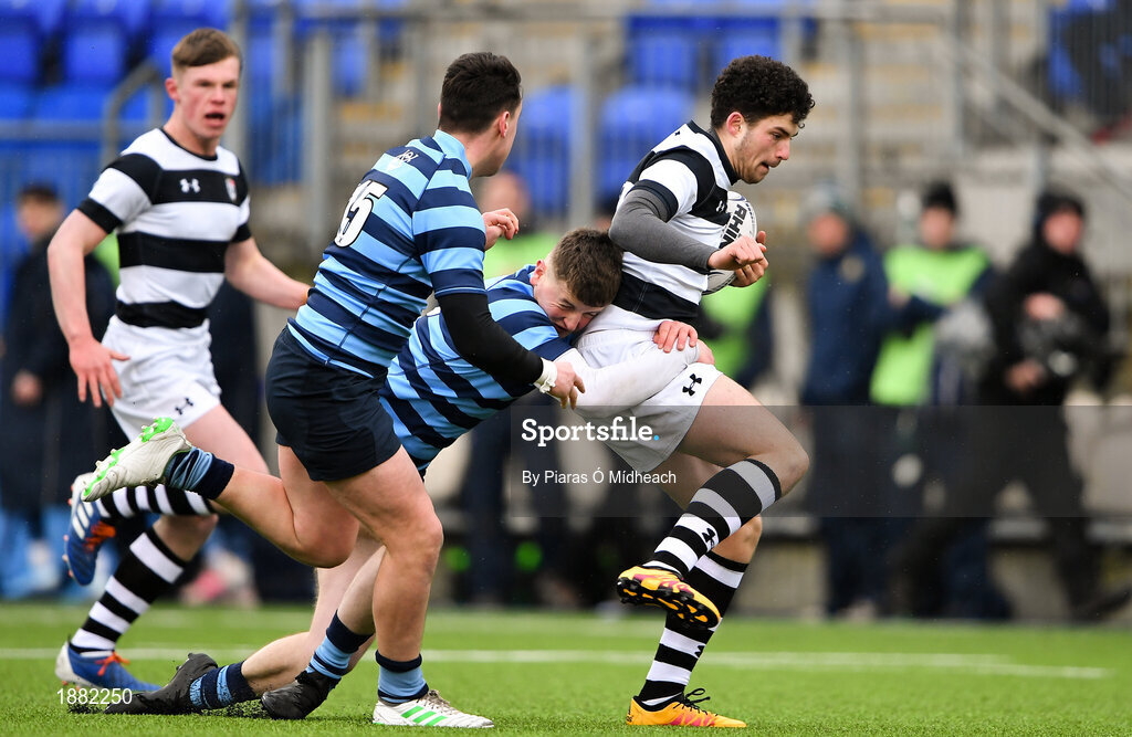 10 February 2020; James Dillon of Belvedere College is tackled by Alex Watson, centre, and Conor Delaney of St Vincent's Castleknock College during the Bank of Ireland Leinster Schools Senior Cup Second Round match between Belvedere College and St Vincent's Castleknock College at Energia Park in Dublin. Photo by Piaras Ó Mídheach/Sportsfile