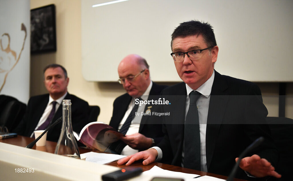 11 February 2020; Ard Stiúrthóir of the GAA Tom Ryan, right, addresses the media alongside Uachtarán Chumann Lúthchleas Gael John Horan and Commercial Director of the GAA and Croke Park Stadium Director Peter McKenna during the GAA/Croke Park Financial Reports and Director General’s Annual Report Media Briefing at the GAA Museum in Croke Park, Dublin. Photo by David Fitzgerald/Sportsfile