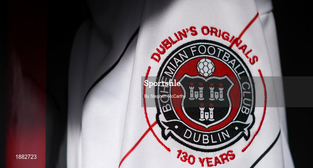 12 February 2020; A detailed view of the Bohemians crest during the launch of the Bohemians FC 2020 away jersey at Dalymount Park in Dublin. Bohemian FC launched their 2020 away jersey, with the iconic and harrowing image of a family fleeing war taking centre place. They’re launching the away jersey in partnership with Amnesty International Ireland, to campaign together for an end to the Direct Provision system. Photo by Stephen McCarthy/Sportsfile