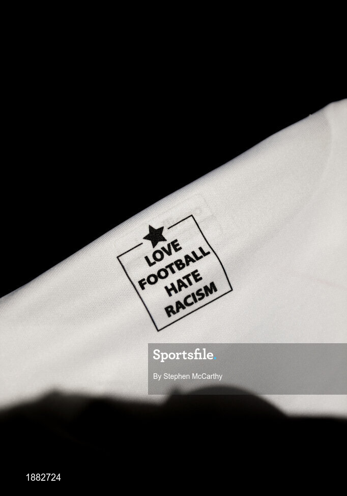 12 February 2020; A detailed view of the words "Love Football Hate Racism" on the Bohemians FC 2020 away jersey at Dalymount Park in Dublin. Bohemian FC launched their 2020 away jersey, with the iconic and harrowing image of a family fleeing war taking centre place. They’re launching the away jersey in partnership with Amnesty International Ireland, to campaign together for an end to the Direct Provision system. Photo by Stephen McCarthy/Sportsfile