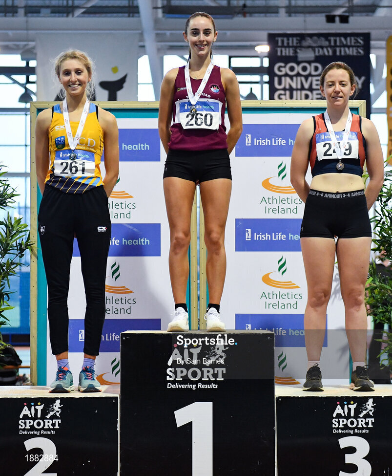 25 January 2020; U23 Women's 800m medallists, from left, Rose Finnegan of UCD AC, Dublin, silver, Claire Fagan of Mullingar Harriers AC, Westmeath, gold, and Richael Browne of Sli Cualann AC, Wicklow, bronze, during the Irish Life Health National Indoor Junior and U23 Championships at the AIT Indoor Arena in Athlone, Westmeath. Photo by Sam Barnes/Sportsfile