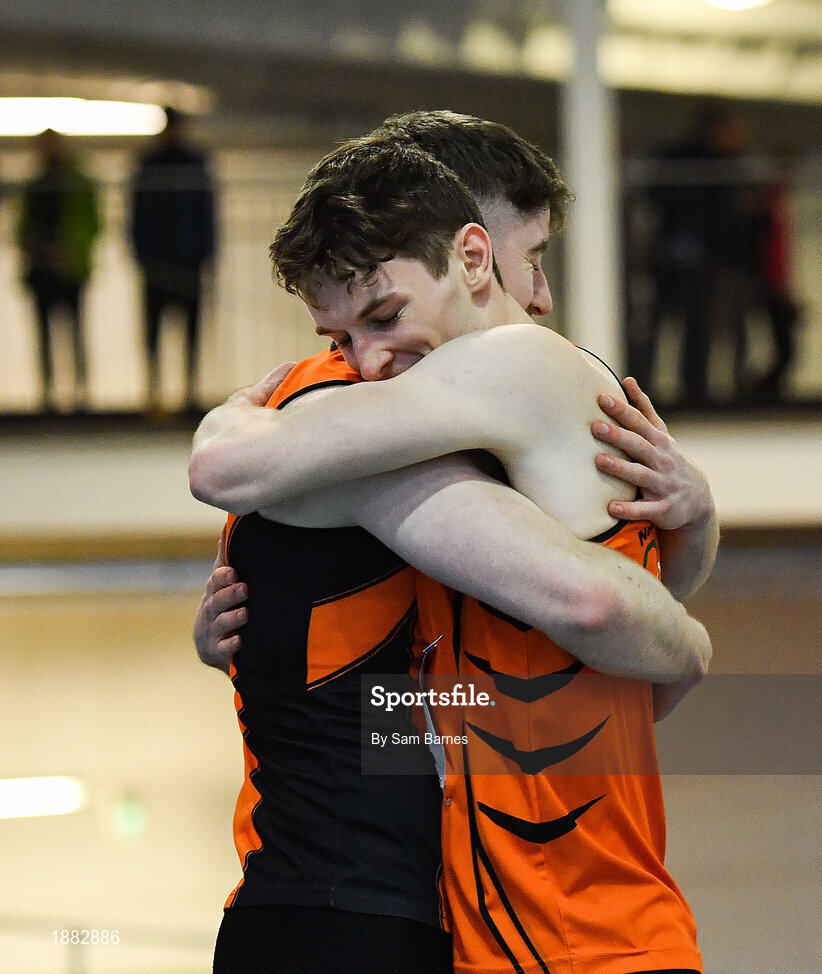 25 January 2020; Darragh Miniter of Nenagh Olympic AC, Tipperary, left, and Joseph Mc Evoy of Nenagh Olympic AC, embrace after competing in the Junior Men's 60m Hurdles during the Irish Life Health National Indoor Junior and U23 Championships at the AIT Indoor Arena in Athlone, Westmeath. Photo by Sam Barnes/Sportsfile