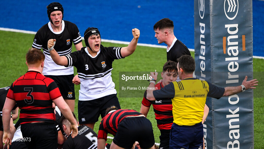 12 February 2020; Zia Ahmed of Newbridge College, centre, celebrates a turn-over during the Bank of Ireland Leinster Schools Senior Cup Second Round match between Kilkenny College and Newbridge College at Energia Park in Dublin. Photo by Piaras Ó Mídheach/Sportsfile
