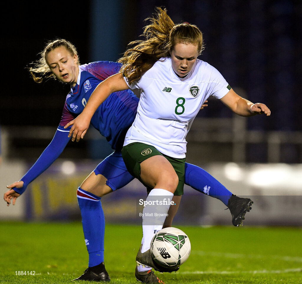 14 February 2020; Muireann Devaney of Republic of Ireland in action against Olöf Sigriaur Kristinsdottir of Iceland during the Women's Under-17s International Friendly between Republic of Ireland and Iceland at the RSC in Waterford United. Photo by Matt Browne/Sportsfile