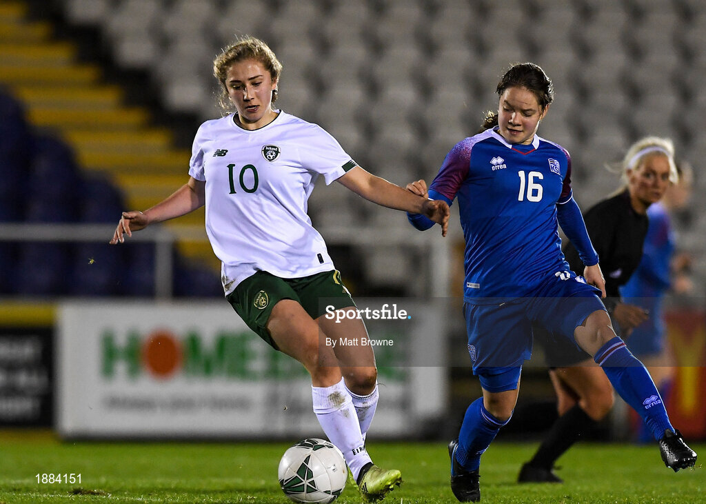 14 February 2020; Ellen Molloy of Republic of Ireland in action against Þórdís Katla Sigurðardóttir of Iceland during the Women's Under-17s International Friendly between Republic of Ireland and Iceland at the RSC in Waterford United. Photo by Matt Browne/Sportsfile