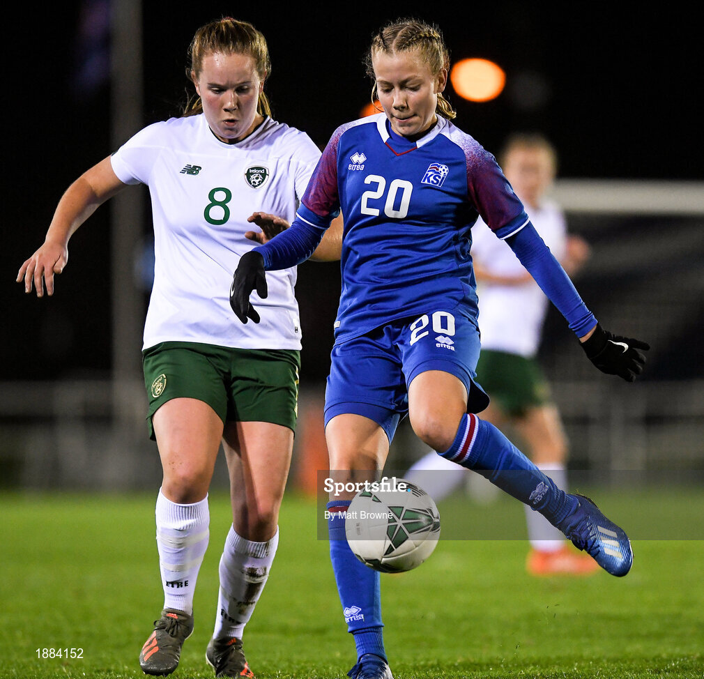 14 February 2020; Amanda Jacobsen Andradóttir of Iceland in action against Muireann Devaney of Republic of Ireland during the Women's Under-17s International Friendly between Republic of Ireland and Iceland at the RSC in Waterford United. Photo by Matt Browne/Sportsfile