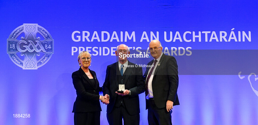 14 February 2020; Hugh Rudden of Ballyhaunis GAA, Mayo, is presented with the Education Award by Maolmhuire Tynan, Head of Public Affairs AIB, and Uachtarán Chumann Lúthchleas Gael John Horan during the GAA President’s Awards at Croke Park in Dublin. Photo by Piaras Ó Mídheach/Sportsfile
