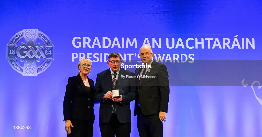 14 February 2020; John McAndrew of St Michael’s GAA Club, Sligo, is presented with the Connacht Award by Maolmhuire Tynan, Head of Public Affairs AIB, and Uachtarán Chumann Lúthchleas Gael John Horan during the GAA President’s Awards at Croke Park in Dublin. Photo by Piaras Ó Mídheach/Sportsfile