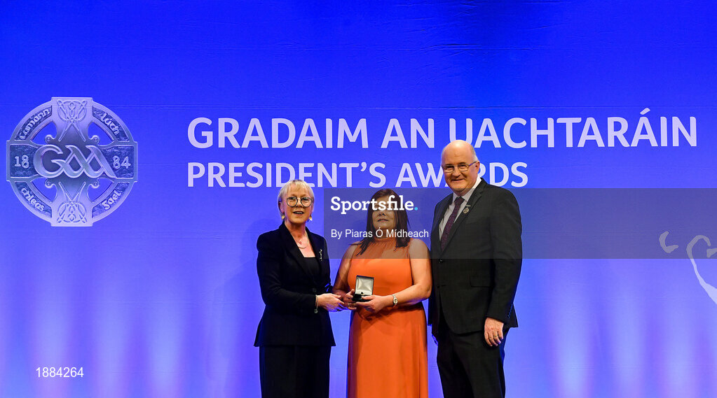 14 February 2020; Maggie Skelton of Achadh Uí Arain, Tír Eoghain, is presented with the Ladies Football Award by Maolmhuire Tynan, Head of Public Affairs AIB, and Uachtarán Chumann Lúthchleas Gael John Horan during the GAA President’s Awards at Croke Park in Dublin. Photo by Piaras Ó Mídheach/Sportsfile
