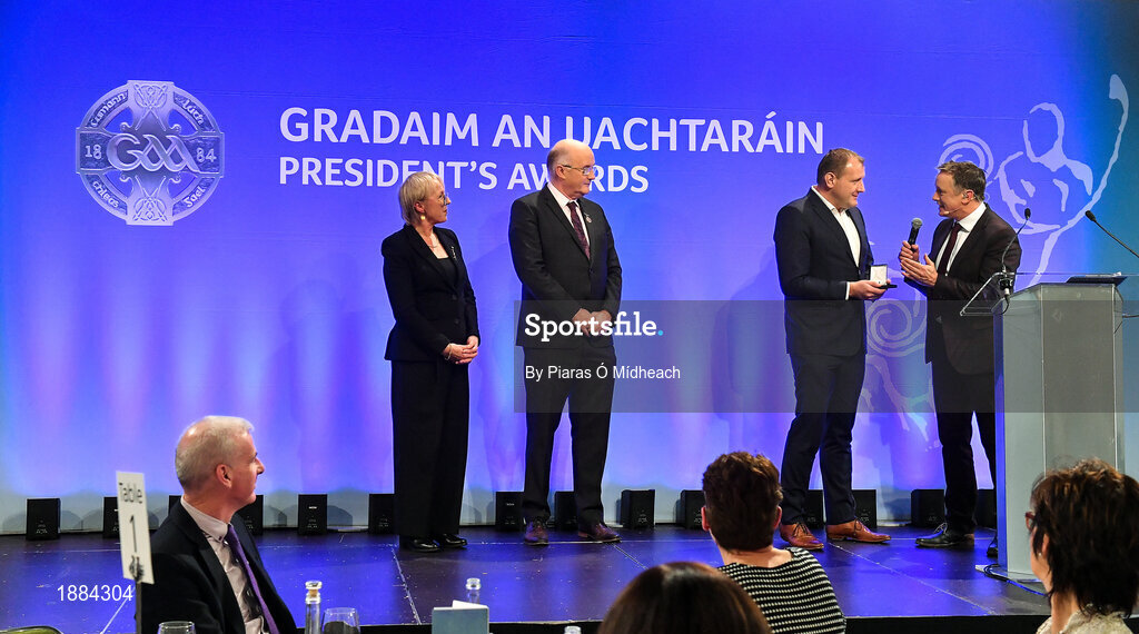 14 February 2020; MC Micheál Ó Domhnaill interviews Pat Gorham of Orang Éire GAA, Malaysia, who won the International Award, alongside Maolmhuire Tynan, Head of Public Affairs AIB, and Uachtarán Chumann Lúthchleas Gael John Horan during the GAA President’s Awards at Croke Park in Dublin. Photo by Piaras Ó Mídheach/Sportsfile