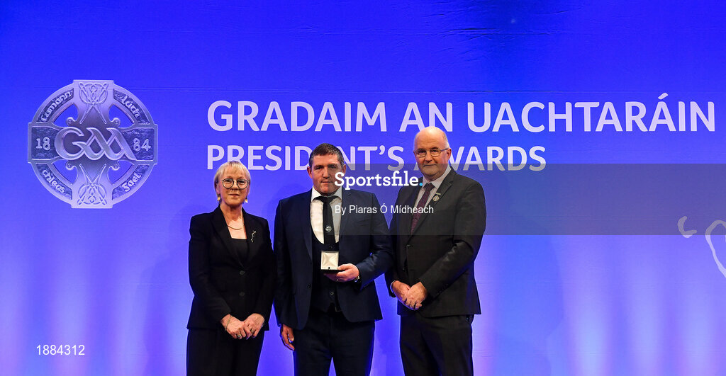14 February 2020; Nick Fitzgerald of Kildalkey GAA, Meath, is presented with the Leinster award by Maolmhuire Tynan, Head of Public Affairs AIB, and Uachtarán Chumann Lúthchleas Gael John Horan during the GAA President’s Awards at Croke Park in Dublin. Photo by Piaras Ó Mídheach/Sportsfile