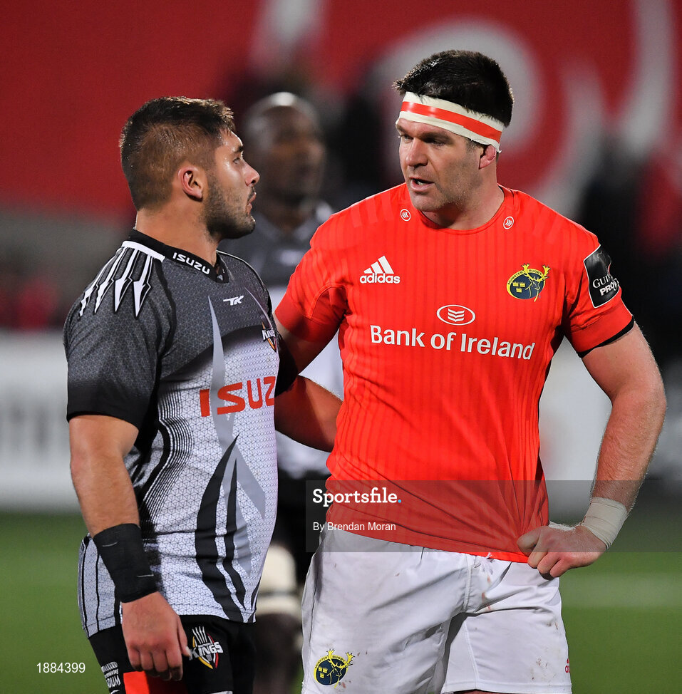 14 February 2020; Alandre van Rooyen of Isuzu Southern Kings, left, and Billy Holland of Munster after the Guinness PRO14 Round 11 match between Munster and Isuzu Southern Kings at Irish Independent Park in Cork. Photo by Brendan Moran/Sportsfile