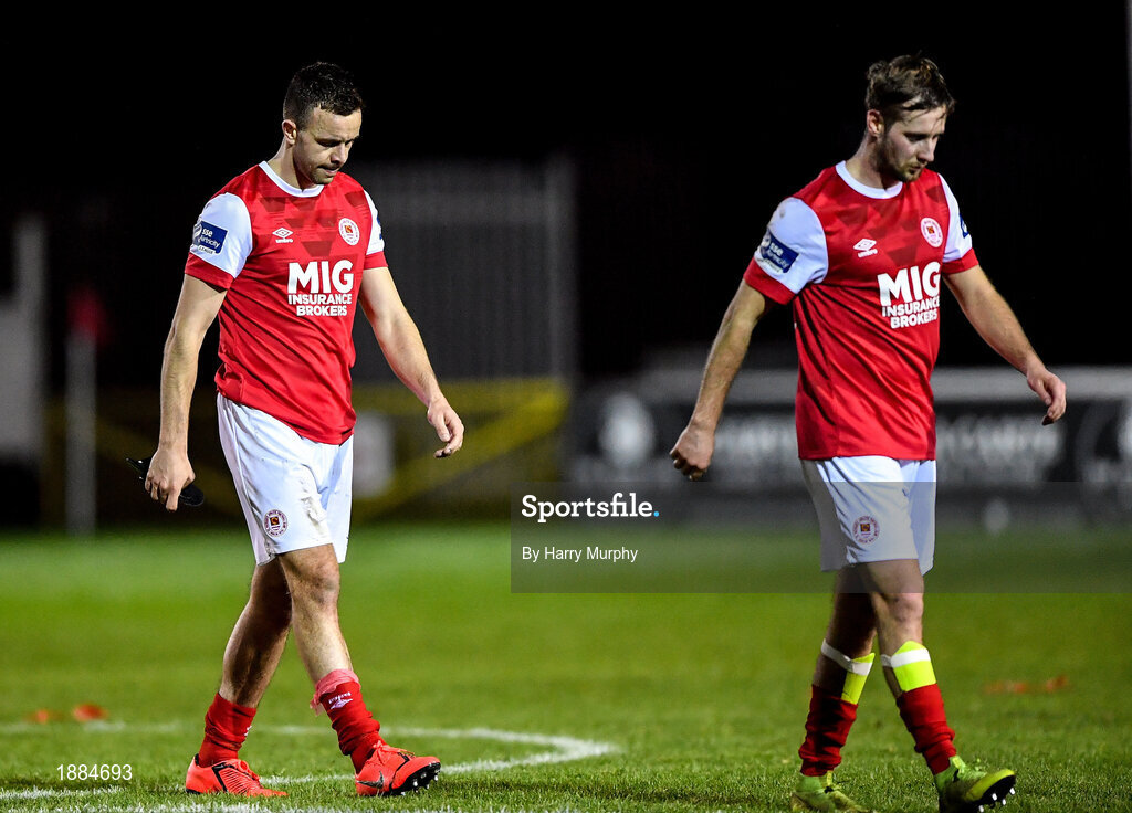 14 February 2020; Robbie Benson, left, and Billy King of St Patrick's Athletic look dejected following the SSE Airtricity League Premier Division match between St Patrick's Athletic and Waterford United at Richmond Park in Dublin. Photo by Harry Murphy/Sportsfile