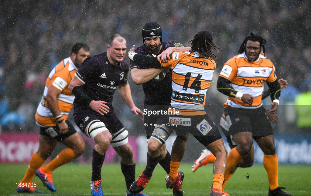 15 February 2020; Scott Fardy of Leinster is tackled by Clayton Blommetjies of Toyota Cheetahs during the Guinness PRO14 Round 11 match between Leinster and Toyota Cheetahs at the RDS Arena in Dublin. Photo by Ramsey Cardy/Sportsfile