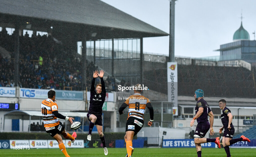 15 February 2020; Tian Schoeman of Toyota Cheetahs kicks under pressure from Ciarán Frawley of Leinster during the Guinness PRO14 Round 11 match between Leinster and Toyota Cheetahs at the RDS Arena in Dublin. Photo by Harry Murphy/Sportsfile
