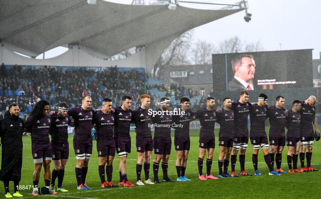 1 February 2020; The Leinster team stand for a minute's silence for former Munster Rugby CEO Garrett Fitzgerald before the Guinness Six Nations Rugby Championship match between Ireland and Scotland at the Aviva Stadium in Dublin. Photo by Ramsey Cardy/Sportsfile