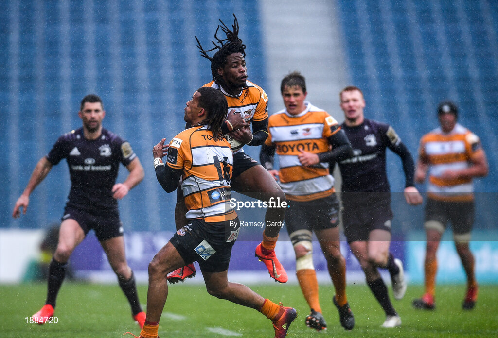 15 February 2020; Clayton Blommetjies, front, and Rabz Maxwane of Toyota Cheetahs collide during the Guinness PRO14 Round 11 match between Leinster and Toyota Cheetahs at the RDS Arena in Dublin. Photo by Ramsey Cardy/Sportsfile