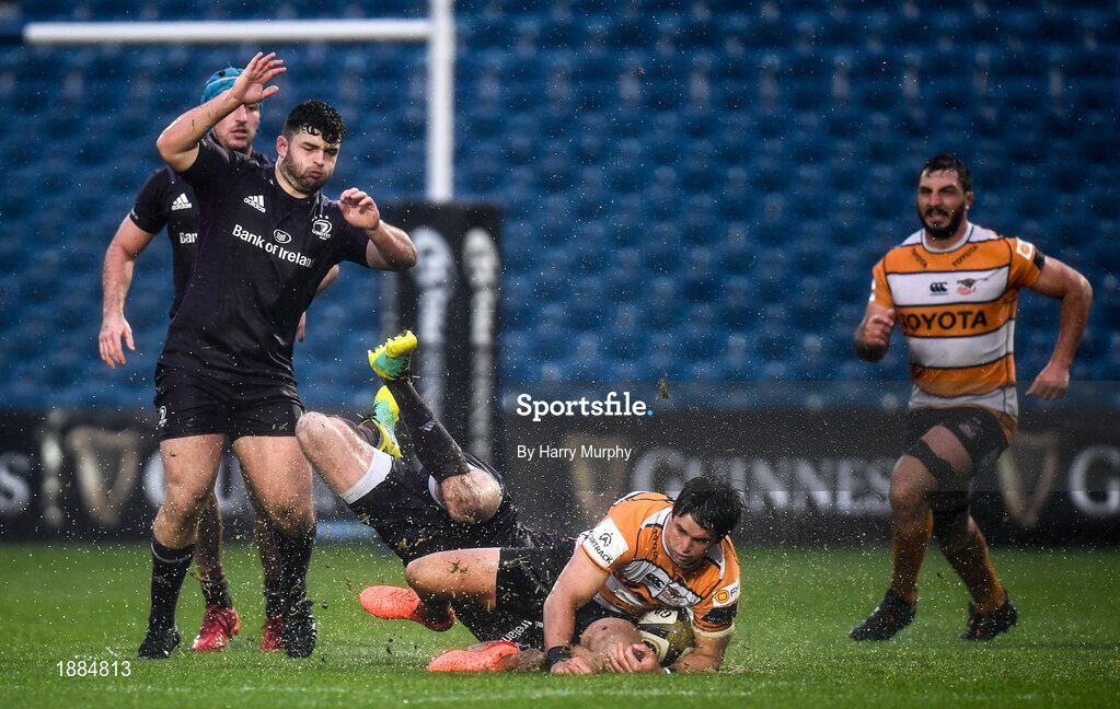 15 February 2020; Benhard Janse van Rensburg of Toyota Cheetahs is tackled by Fergus McFadden of Leinster during the Guinness PRO14 Round 11 match between Leinster and Toyota Cheetahs at the RDS Arena in Dublin. Photo by Harry Murphy/Sportsfile