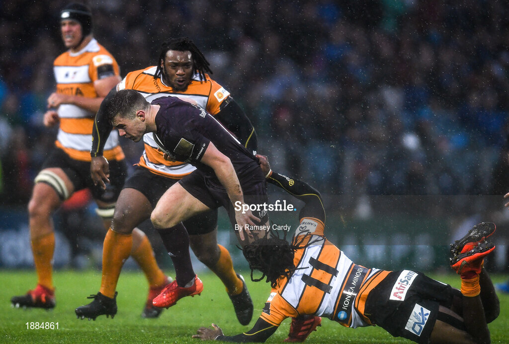 15 February 2020; Luke McGrath of Leinster is tackled by Rabz Maxwane of Toyota Cheetahs during the Guinness PRO14 Round 11 match between Leinster and Toyota Cheetahs at the RDS Arena in Dublin. Photo by Ramsey Cardy/Sportsfile