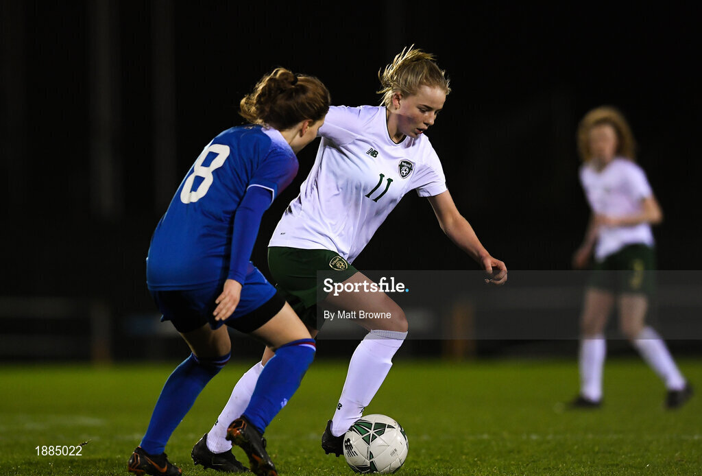 14 February 2020; Kerryanne Brown of Republic of Ireland in action against Bergþóra Sól Ásmundsdóttir of Iceland during the Women's Under-17s International Friendly between Republic of Ireland and Iceland at the RSC in Waterford United. Photo by Matt Browne/Sportsfile