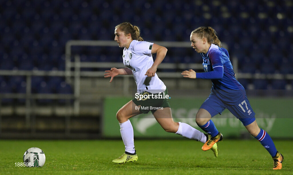 14 February 2020; Ellen Molloy of Republic of Ireland in action against Sara Dögg Ásþórsdóttir of Iceland during the Women's Under-17s International Friendly between Republic of Ireland and Iceland at the RSC in Waterford United. Photo by Matt Browne/Sportsfile
