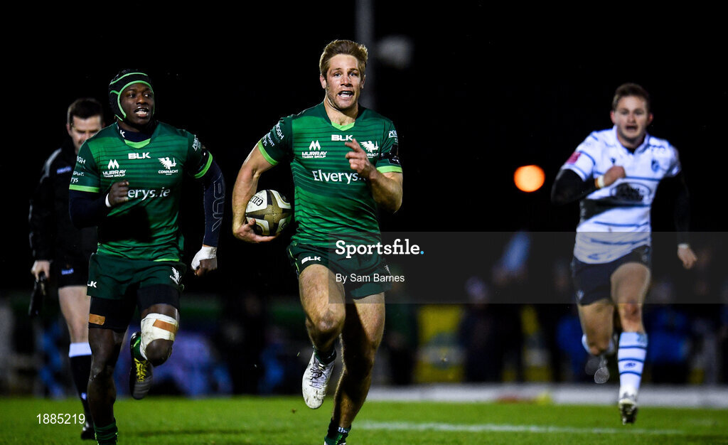 15 February 2020; Kyle Godwin of Connacht on his way to scoring his side's fourth try during the Guinness PRO14 Round 11 match between Connacht and Cardiff Blues at the Sportsground in Galway. Photo by Sam Barnes/Sportsfile