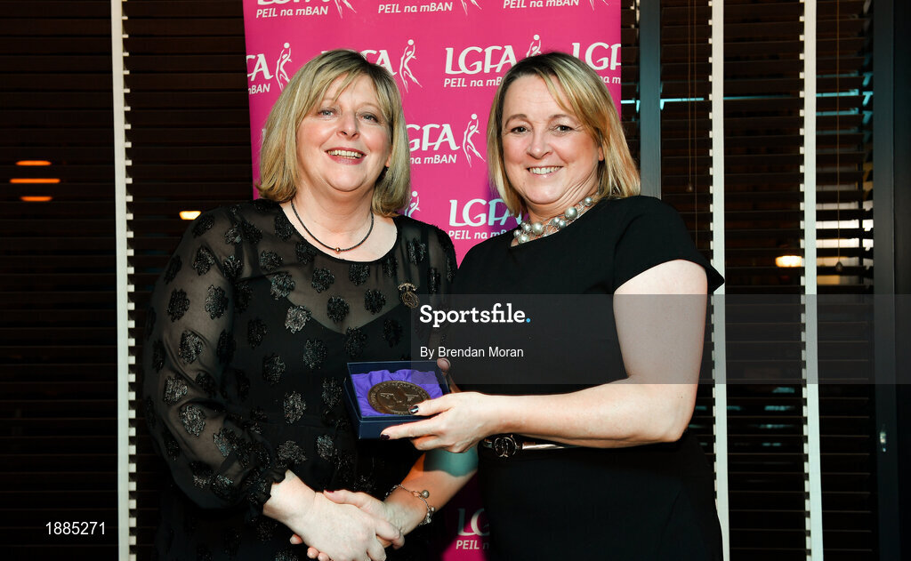 15 February 2020; Eileen Jones from Aodh Ruadh GAA club in Dungannon, Tyrone is presented with her Administration medallion by LGFA President Marie Hickey during the Learn to Lead – LGFA Female Leadership Programme graduation evening at The Croke Park, Jones Road, Dublin. The Learn to Lead programme was devised to develop the next generation of leaders within Ladies Gaelic Football. Photo by Brendan Moran/Sportsfile