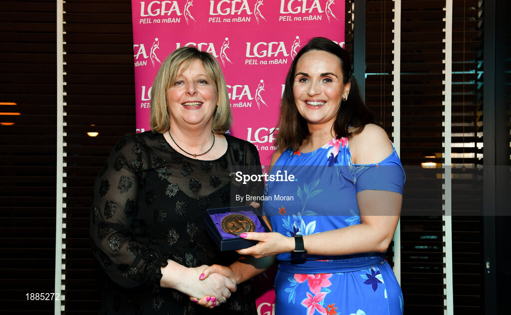 15 February 2020; Eimear O’Connor from Mountrath in Laois is presented with her Administration medallion by LGFA President Marie Hickey during the Learn to Lead – LGFA Female Leadership Programme graduation evening at The Croke Park, Jones Road, Dublin. The Learn to Lead programme was devised to develop the next generation of leaders within Ladies Gaelic Football. Photo by Brendan Moran/Sportsfile