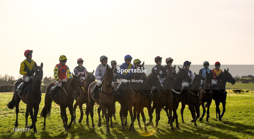 16 February 2020; Horses and riders approach their posts prior to the Kevin Brady Car Sales Mares Handicap Hurdle at Navan Racecourse in Navan, Meath. Photo by Harry Murphy/Sportsfile