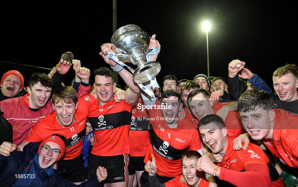 12 February 2020; UCC players celebrate with the cup after the Fitzgibbon Cup Final match between UCC and IT Carlow at Dublin City University Sportsgrounds in Glasnevin, Dublin. Photo by Piaras Ó Mídheach/Sportsfile