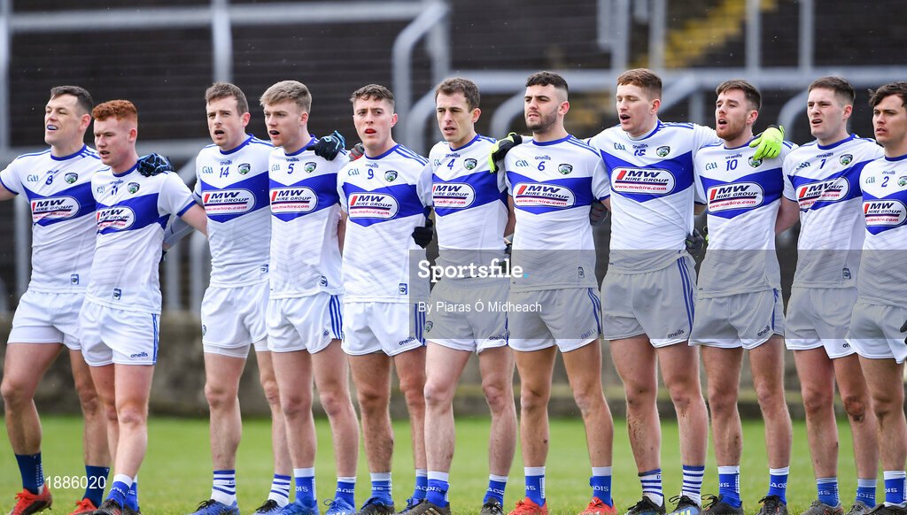 16 February 2020; Laois players stand for Amhrán na bhFiann before the Allianz Football League Division 2 Round 3 match between Laois and Cavan at MW Hire O'Moore Park in Portlaoise, Laois. Photo by Piaras Ó Mídheach/Sportsfile