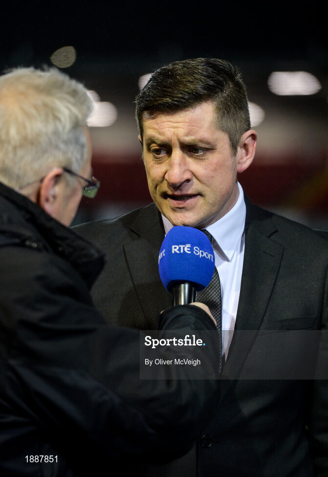 21 February 2020; Derry City manager Declan Devine, right, is interviewed by RTÉ's Tony O'Donoghue prior to the SSE Airtricity League Premier Division match between Derry City and Finn Harps at Ryan McBride Brandywell Stadium in Derry. Photo by Oliver McVeigh/Sportsfile