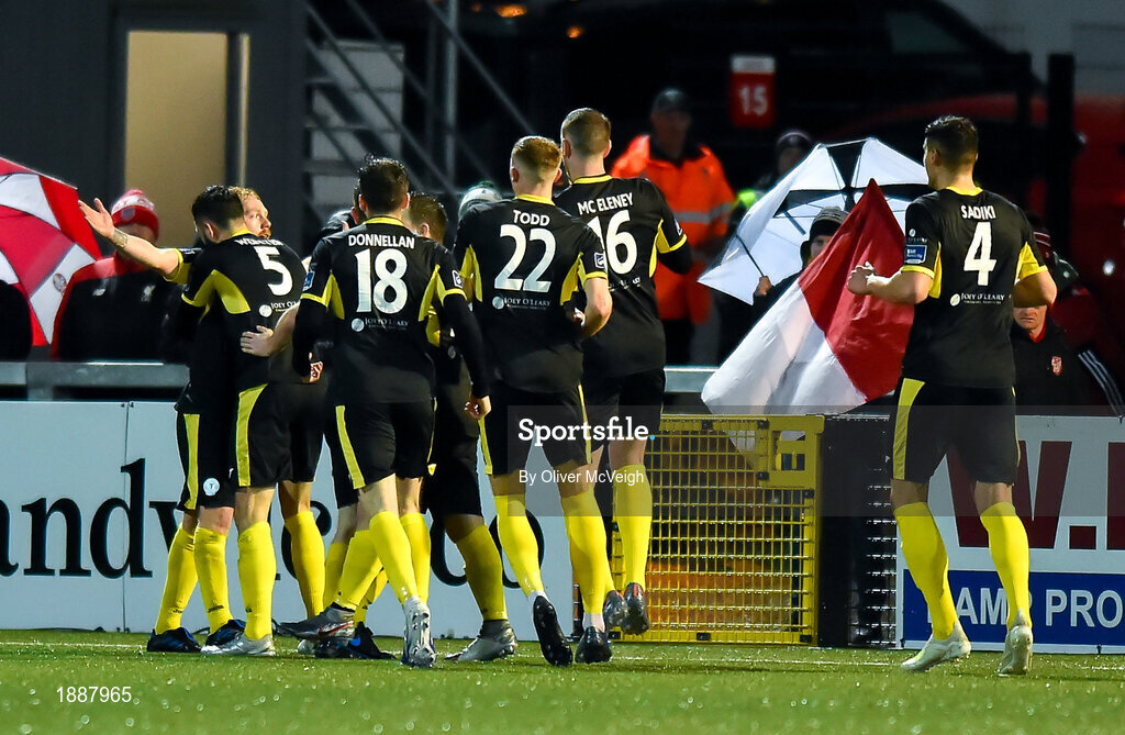 21 February 2020; Ryan Connolly of Finn Harps, left, celebrates after scoring his sides first goal during the SSE Airtricity League Premier Division match between Derry City and Finn Harps at Ryan McBride Brandywell Stadium in Derry. Photo by Oliver McVeigh/Sportsfile