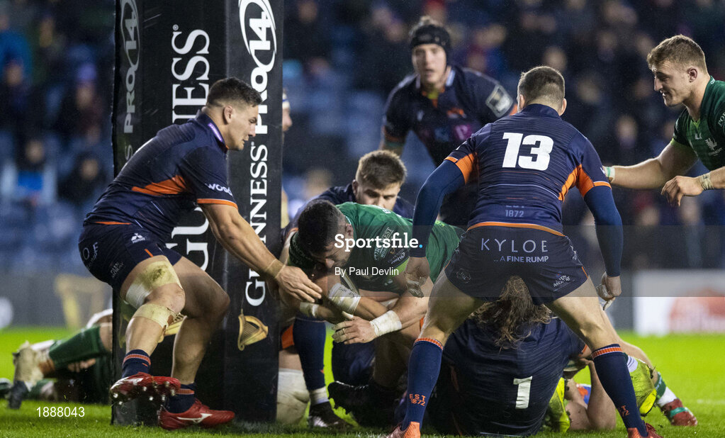 21 February 2020; Tiernan O'Halloran of Connacht goes over to score his side's second try during the Guinness PRO14 Round 12 match between Edinburgh and Connacht at BT Murrayfield in Edinburgh, Scotland. Photo by Paul Devlin/Sportsfile