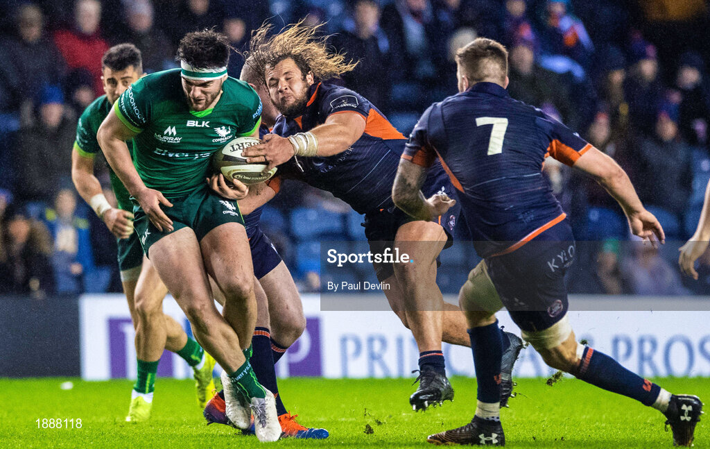21 February 2020; Tom Daly of Connacht is tackled by Pierre Schoeman of Edinburgh during the Guinness PRO14 Round 12 match between Edinburgh and Connacht at BT Murrayfield in Edinburgh, Scotland. Photo by Paul Devlin/Sportsfile